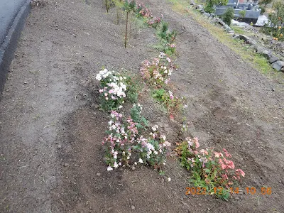 草木灰を道路沿いに置く。カイヅカイブキは5本植えられそうだった。